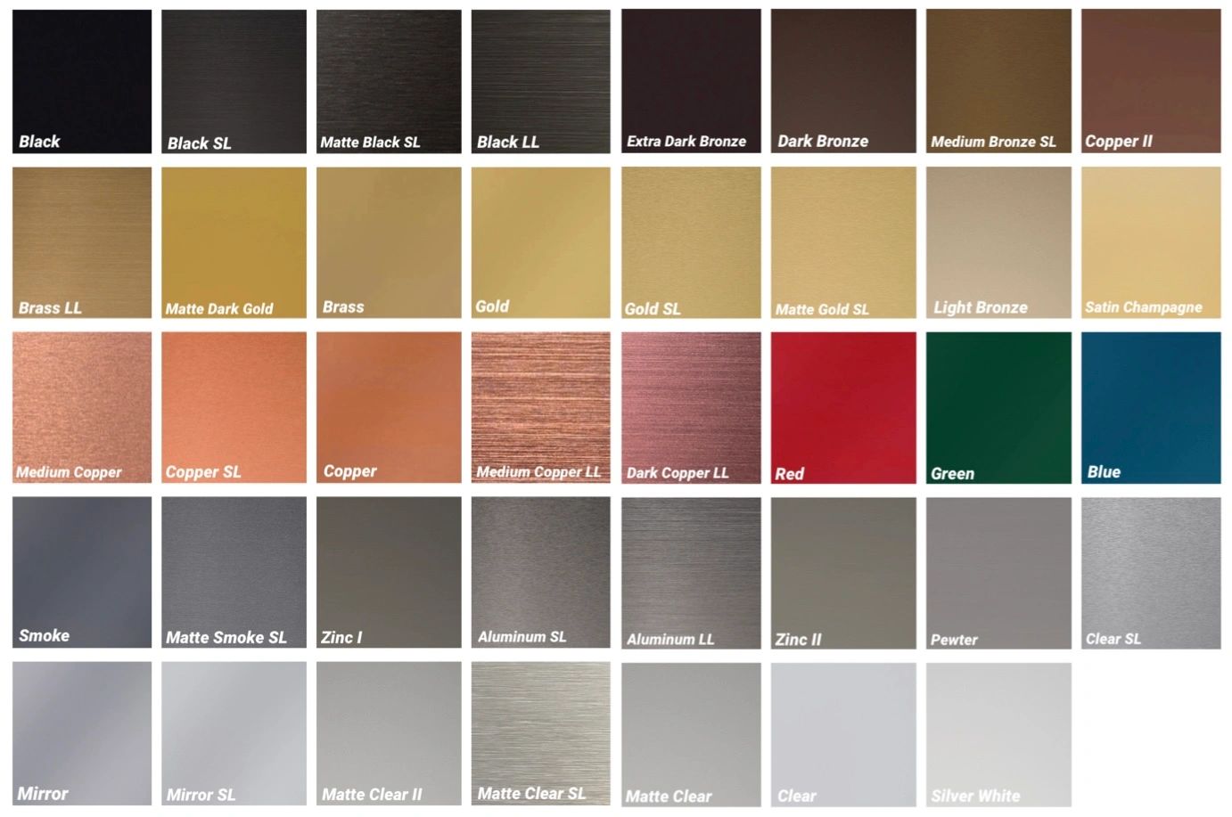Whatever your design calls for, we have you, uh..., covered. (Get it?) From Anodized finishes to Wood Grain Powder Coating to Custom Color Matching, we have what you need to pull your design together. In addition to the below offerings, we can also provide custom, hand-worked finishes to give your panels a truly one-of-a-kind look and feel!